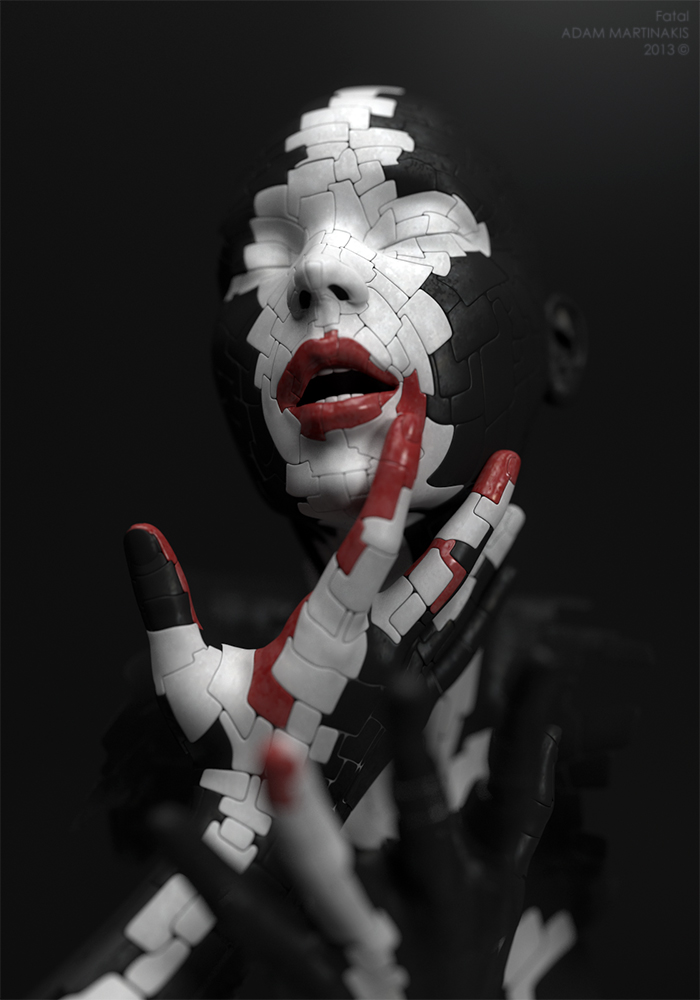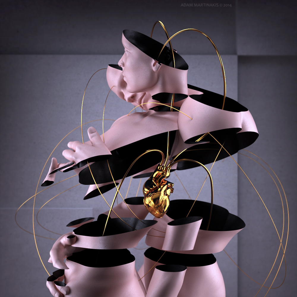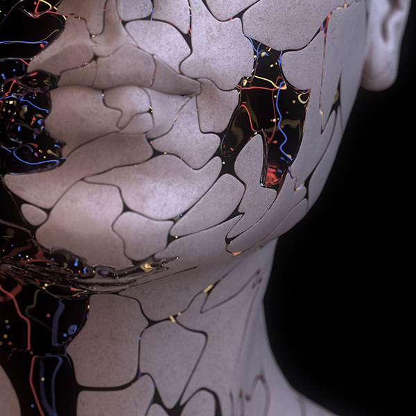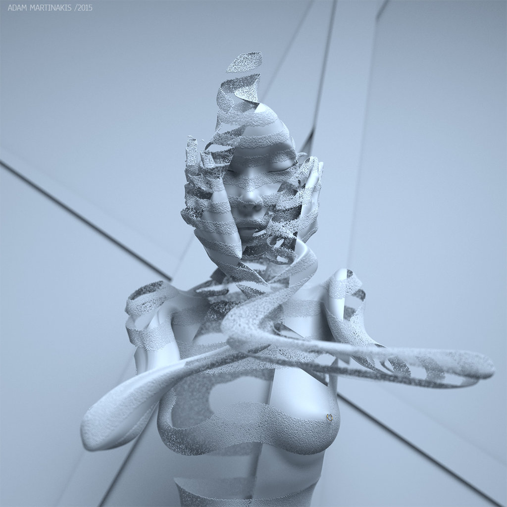 Le forme umanoidi, che si vengono a creare attraverso la sua opera di modellazione, risultano essere figure silenziose che raccontano la complessità dell’amore romantico, l’angoscia della condizione umana, la solitudine, la difficoltà di esprimersi, rileggendo molti autori fra cui è evidente un richiamo alla languida sofferenza di Edvard Munch. Le atmosfere che circondano i protagonisti delle sue immagini sono invece una miscela unica di Surrealismo e Futurismo completata da scenari fantascientifici digitali. Molte delle sue figure umane sono posizionate all’interno di strutture postindustriali decadenti, orbite di pianeti asettici o la composizione di atomi disgregati.